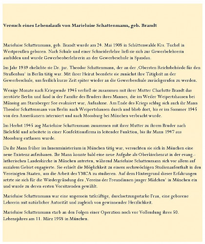 "Auch in den 50-er-Jahren war es sehr schwierig als Lehrling, Studentin oder bereits in Arbeit Stehende ein möbliertes Zimmer zu bekommen. Es hat sich herum gesprochen, dass in Schwabing, immer schon ein Anziehungsviertel in München, ein Heim für junge Frauen besteht, das Marie-Luise-Schattenmann-Haus. Damals war die Adresse Zentnerstr. 62, heutige Friedrich-Loy-Straße. Aber um in dieses Heim zu kommen, kam man erst auf eine Warteliste und musste zwei Empfehlungen vorlegen. Besonders gut war es, wenn diese Empfehlung von einem Pfarrer kam.