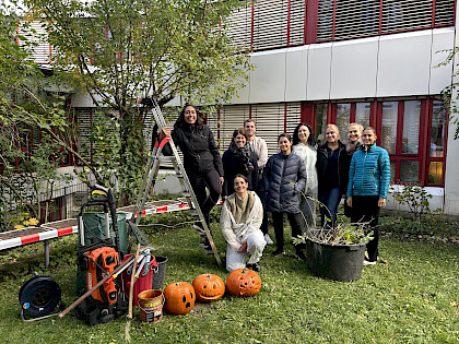 Uns wurde der trockenste Tag der Woche zuteil und eine entschlossene Gruppe von Consors Finanz aus München trat bei uns an, um unsere herbstlichen Gartenvorhaben anzupacken: Büsche und Hecken zurückschneiden, das Laub unserer großen Bäume einsammeln, die Wetterleisten an unserem Hüttchen erneuern, die Holzsitzflächen unserer Bänke demontieren und neu einlassen, eine Terrasse nebst Mobiliar einer Bewohnerinnen-WG kärchern und dabei auch noch gleich verschönern. Das Team gönnte sich keine Pause und es blieb sogar noch Zeit fürs Kürbisschnitzen.